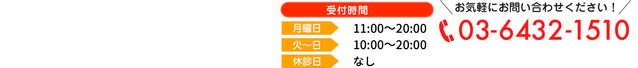 休診日がなく、毎日夜20時まで受付しており土曜、日曜、祝日も受付しておりますのでお仕事や学校で忙しくて中々時間がとれない方でも仕事帰りや土曜、日曜、祝日にご来院頂けます。